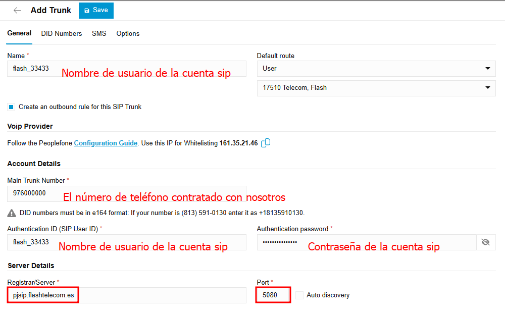 Después de esto pulsas en Guardar / Save y el trunk se registrará.